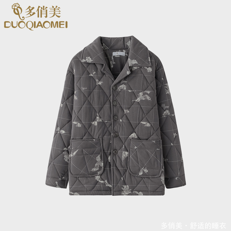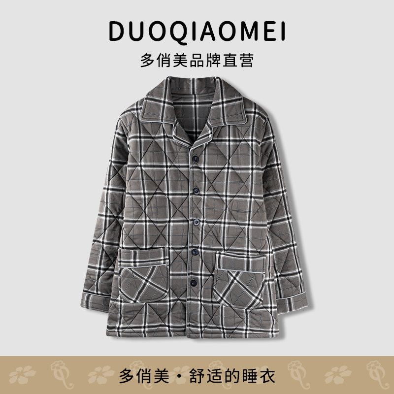 冬季男士单件睡衣开衫长袖家居服三层夹棉袄保暖加厚可外穿外套冬