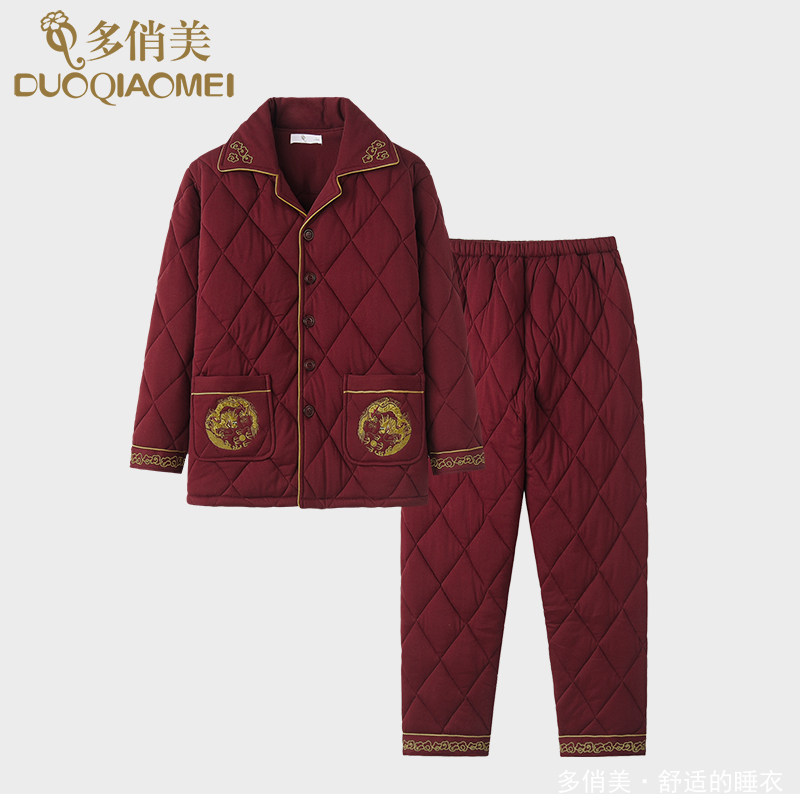 中国风睡衣男士冬季三层加厚保暖纯棉夹棉袄可外穿家居服大码套装