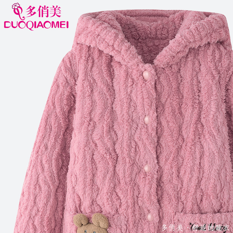 秋冬款珊瑚绒睡衣女加绒加厚三层夹棉袄冬季法兰绒带帽家居服套装