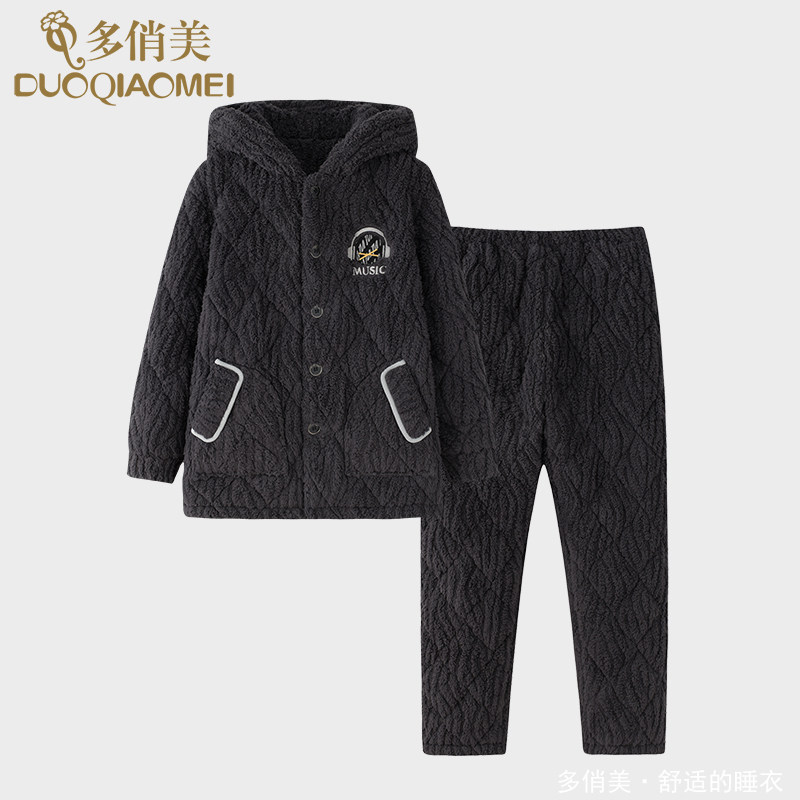 睡衣男士冬季珊瑚绒夹棉袄秋冬款三层加厚冬天法兰绒保暖加绒套装