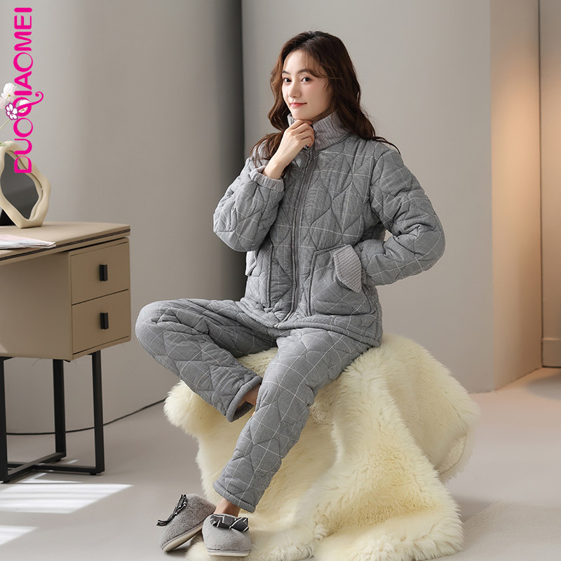 新款睡衣冬季女款纯棉三层加厚夹棉保暖加绒加大码棉袄套装家居服
