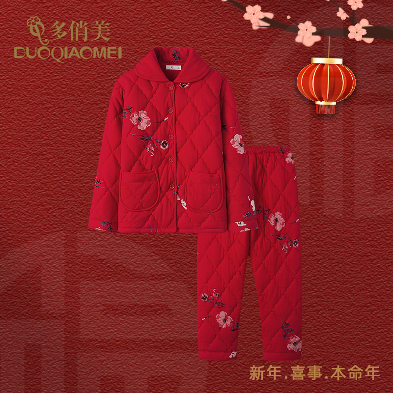 秋冬季睡衣女纯棉夹棉袄加厚保暖红色中年妈妈冬款全棉家居服套装