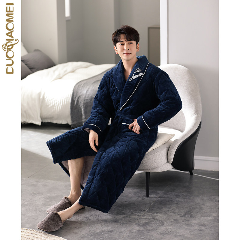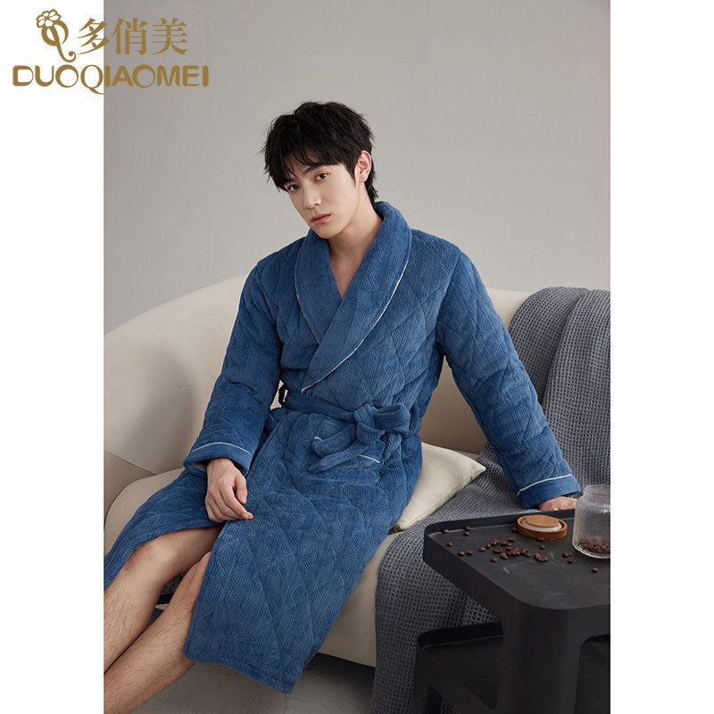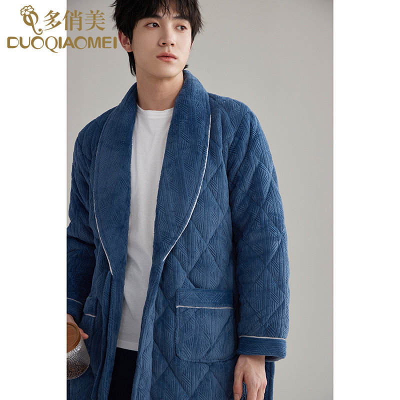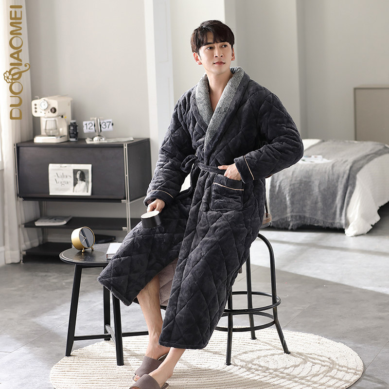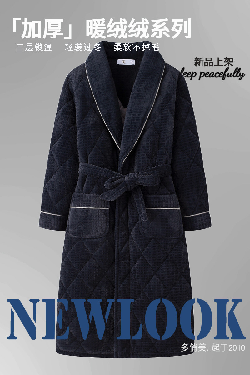 男士睡衣秋冬季加厚加绒珊瑚绒三层保暖夹棉加大码可外穿睡袍浴袍