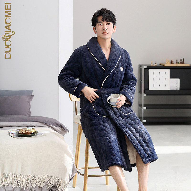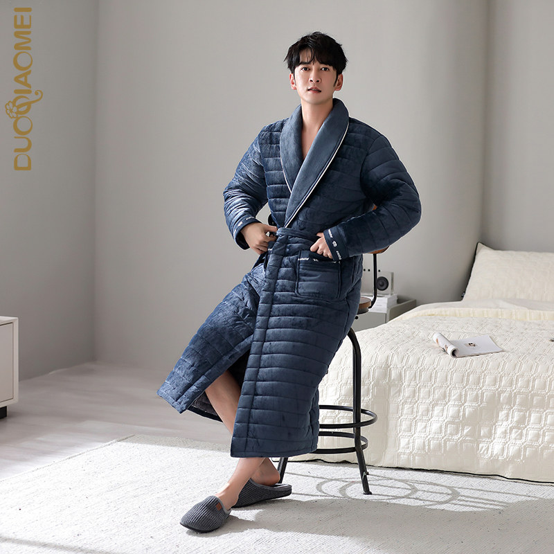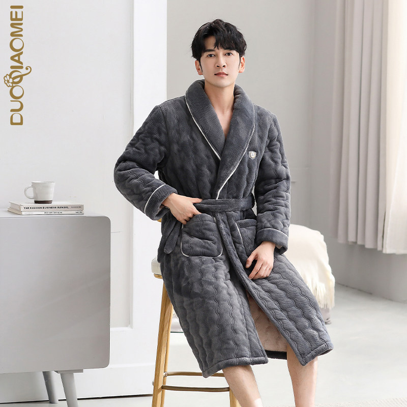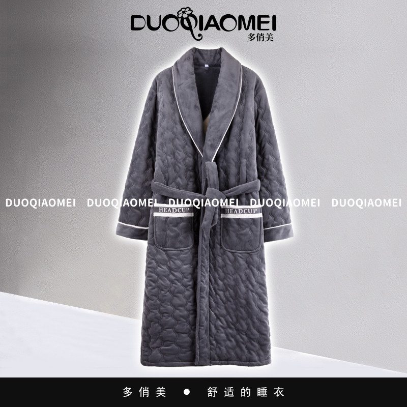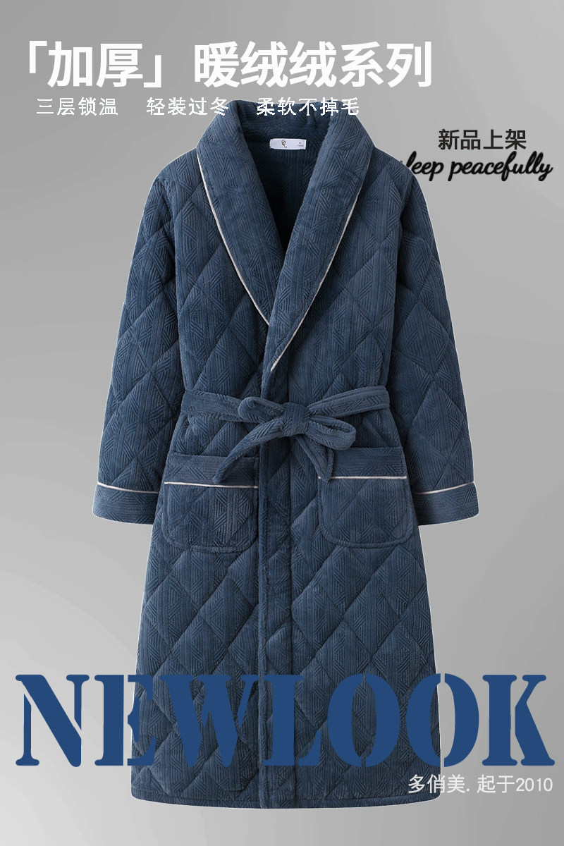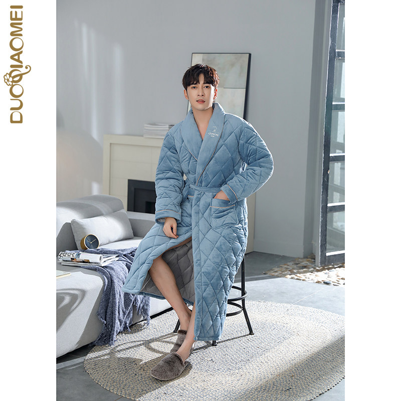 男士睡衣秋冬季加厚加绒珊瑚绒三层保暖夹棉加大码可外穿睡袍浴袍