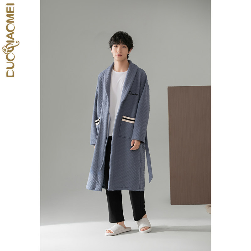 睡袍男春秋冬纯棉夹层浴袍空气棉薄夹棉中长款春秋年轻大码家居服