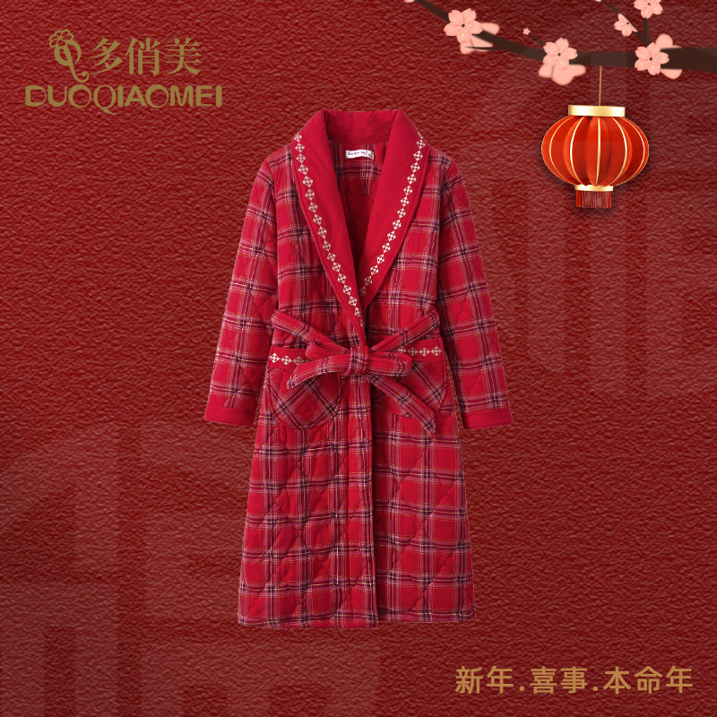2024年新款大红色本命年格子睡袍女秋冬款纯棉夹棉中长款睡衣浴袍