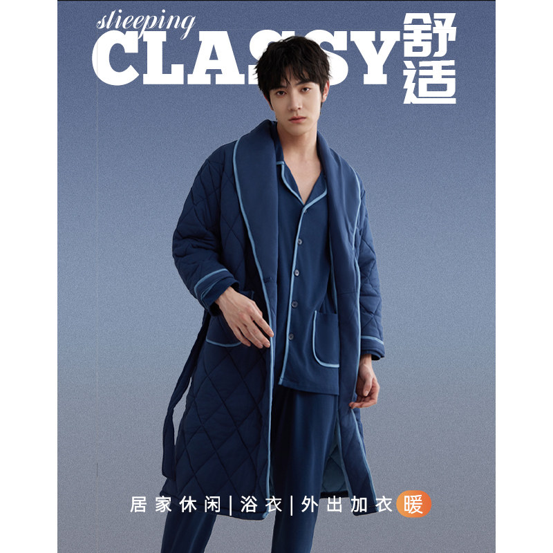 【三件套】睡袍男秋冬季纯棉加厚保暖三层夹棉中长款浴袍睡衣棉袄