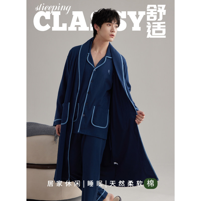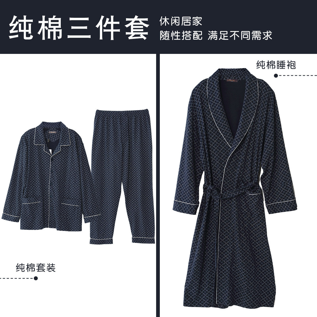 睡袍男春秋纯棉长袖宽松大码浴袍长款男士睡衣秋冬家居服三件套装