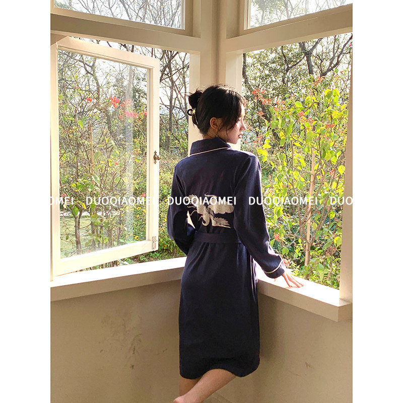 仙鹤国风睡袍女士睡衣春秋季纯棉长袖长款浴袍晨袍薄款大码中青年