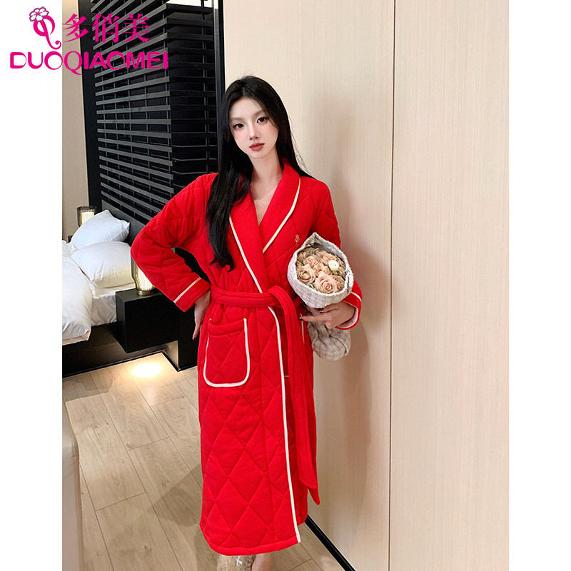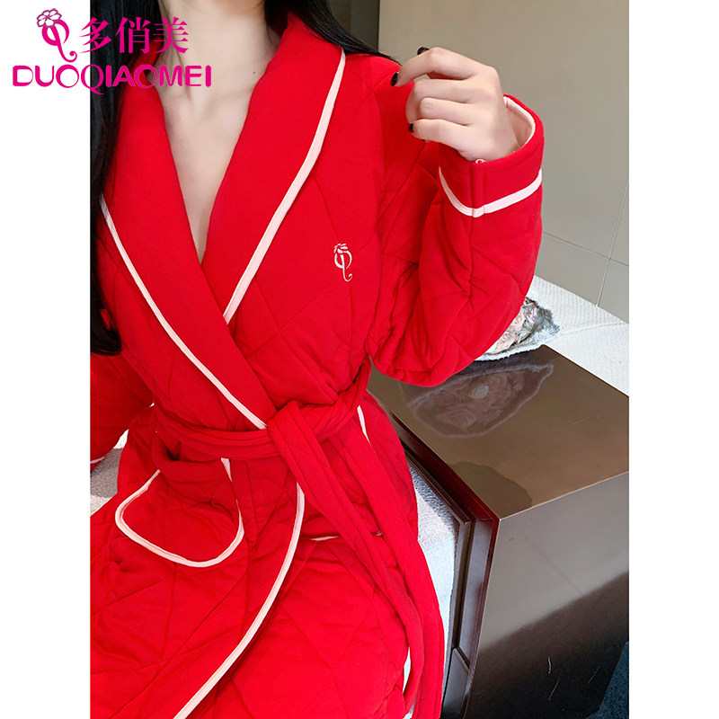 夹棉睡袍红色女士冬季纯棉三层加厚全棉中长款浴袍睡衣大码家居服