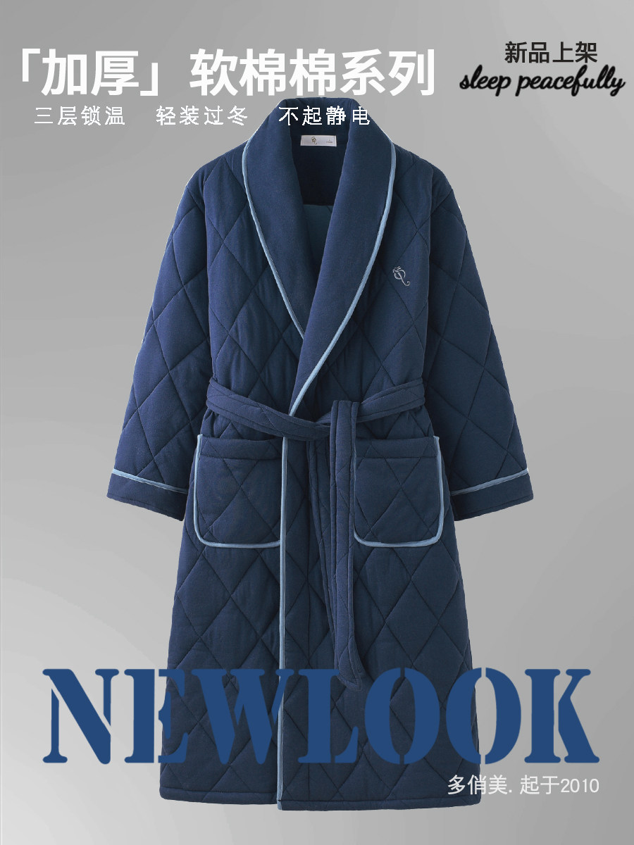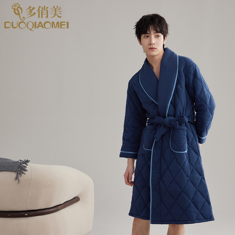 男士睡衣秋冬款纯棉夹棉加厚保暖三层中长款冬季睡袍晨袍浴袍全棉