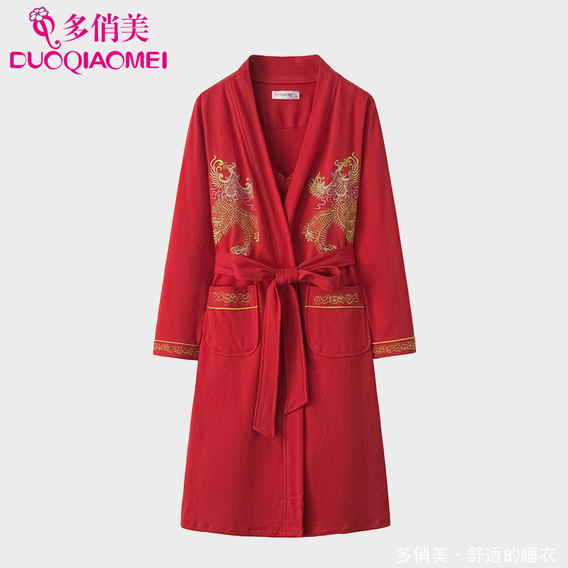红色性感吊带睡裙晨袍新娘薄款长袖睡袍套装睡衣女春秋款纯棉浴袍