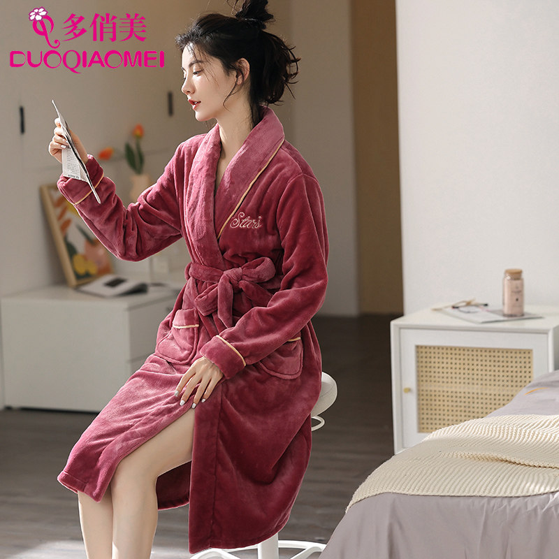 珊瑚绒睡袍女秋冬季长款浴袍三层夹棉加厚加绒睡衣冬天保暖家居服