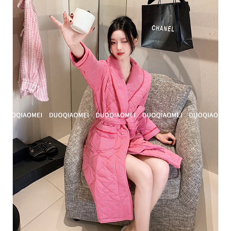 纯棉夹棉睡袍女秋冬款条纹中长款浴袍浴衣全棉睡衣晨袍女棉袄保暖