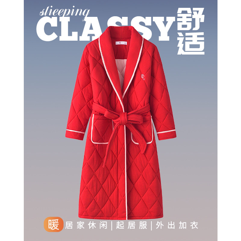 睡袍女秋冬季三层夹棉加厚纯棉长款睡衣红色本命年浴袍家居服冬款