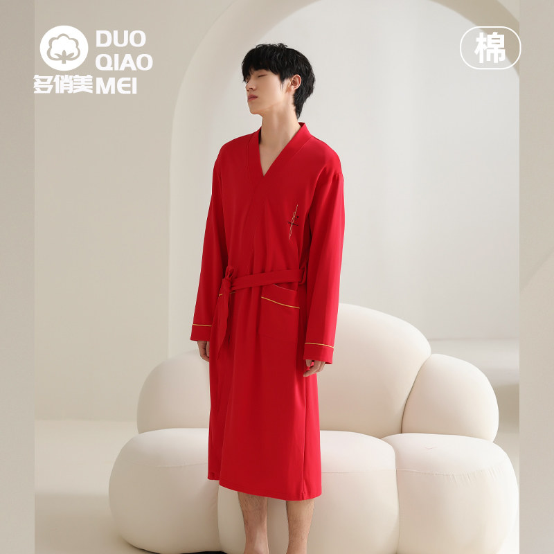 睡袍女士睡衣春秋季浴袍睡裙长款薄款红色纯棉长袖浴衣日式加大码