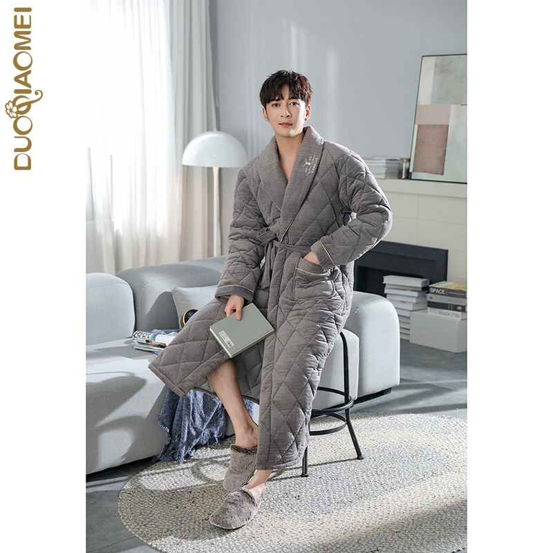 睡袍男士睡衣加厚纯棉秋冬款三层保暖夹棉浴袍浴衣中长款全棉冬季