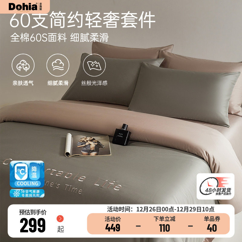 多喜爱60支四件套全棉纯棉床单被套轻奢床上用品四件套浅雾浮光米