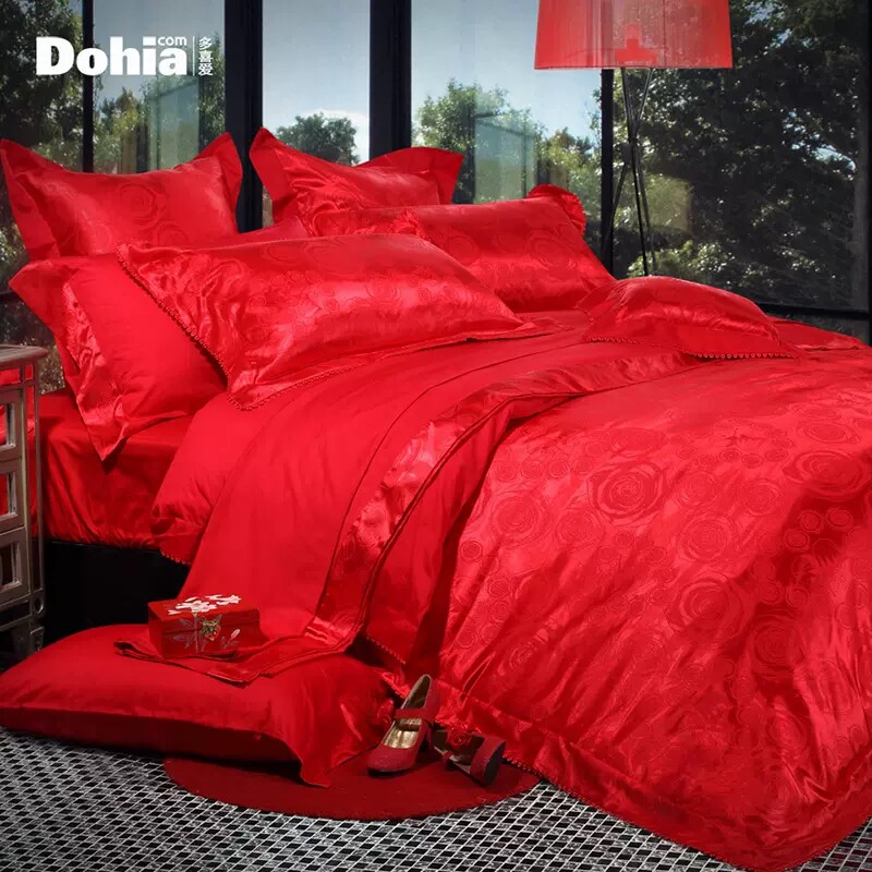 多喜爱婚庆60支套件结婚四件套床上用品纯棉全棉大红色新婚嫁纳福