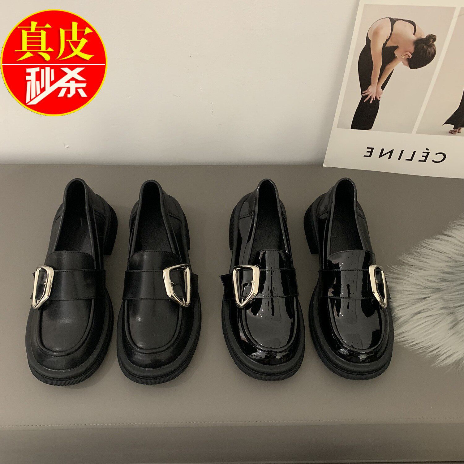 青蕴真皮乐福鞋女厚底英伦小皮鞋设计感小众黑色休闲单鞋2023新款