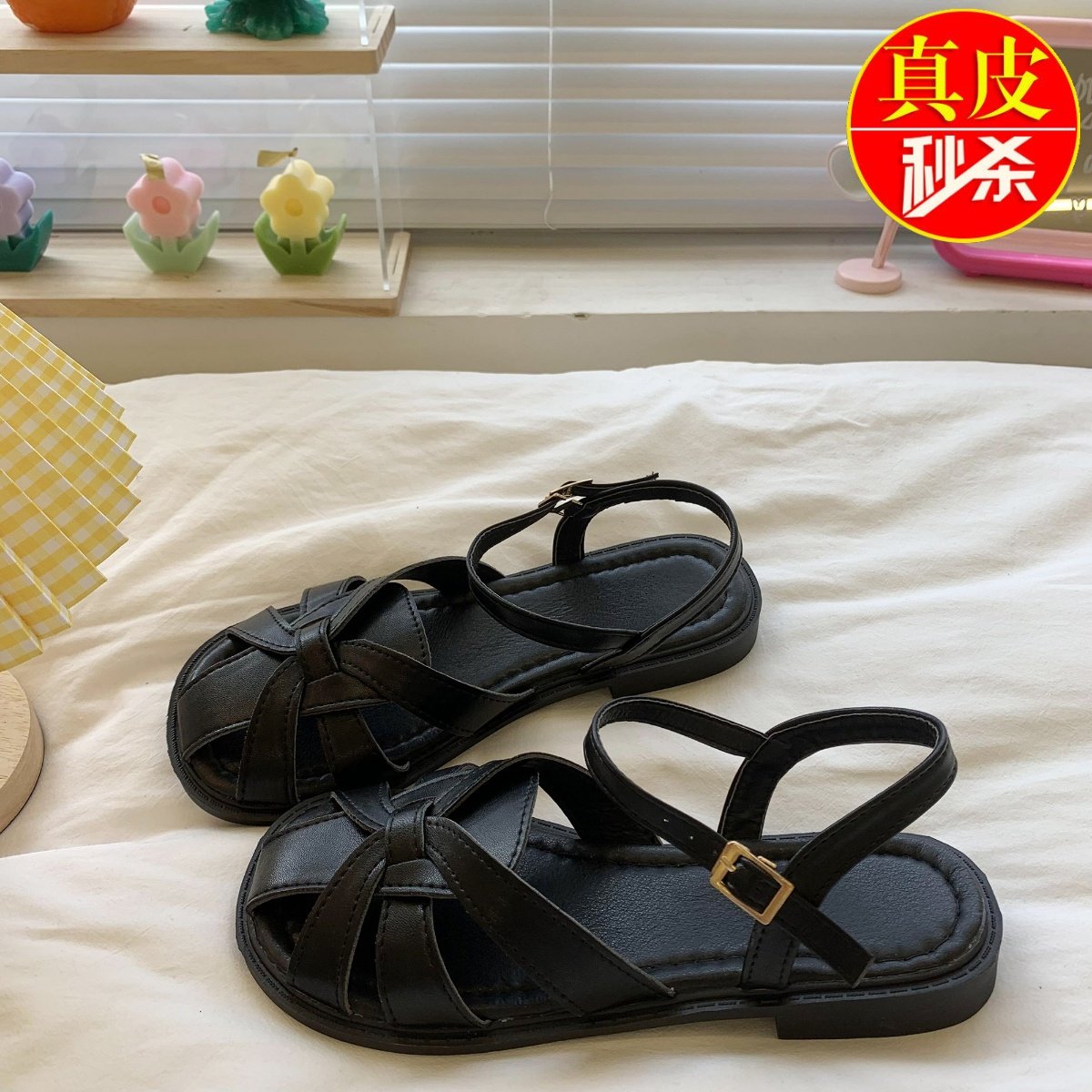 青蕴真皮夏季新款凉鞋女厚底百搭不累脚系带休闲运动罗马沙滩鞋子
