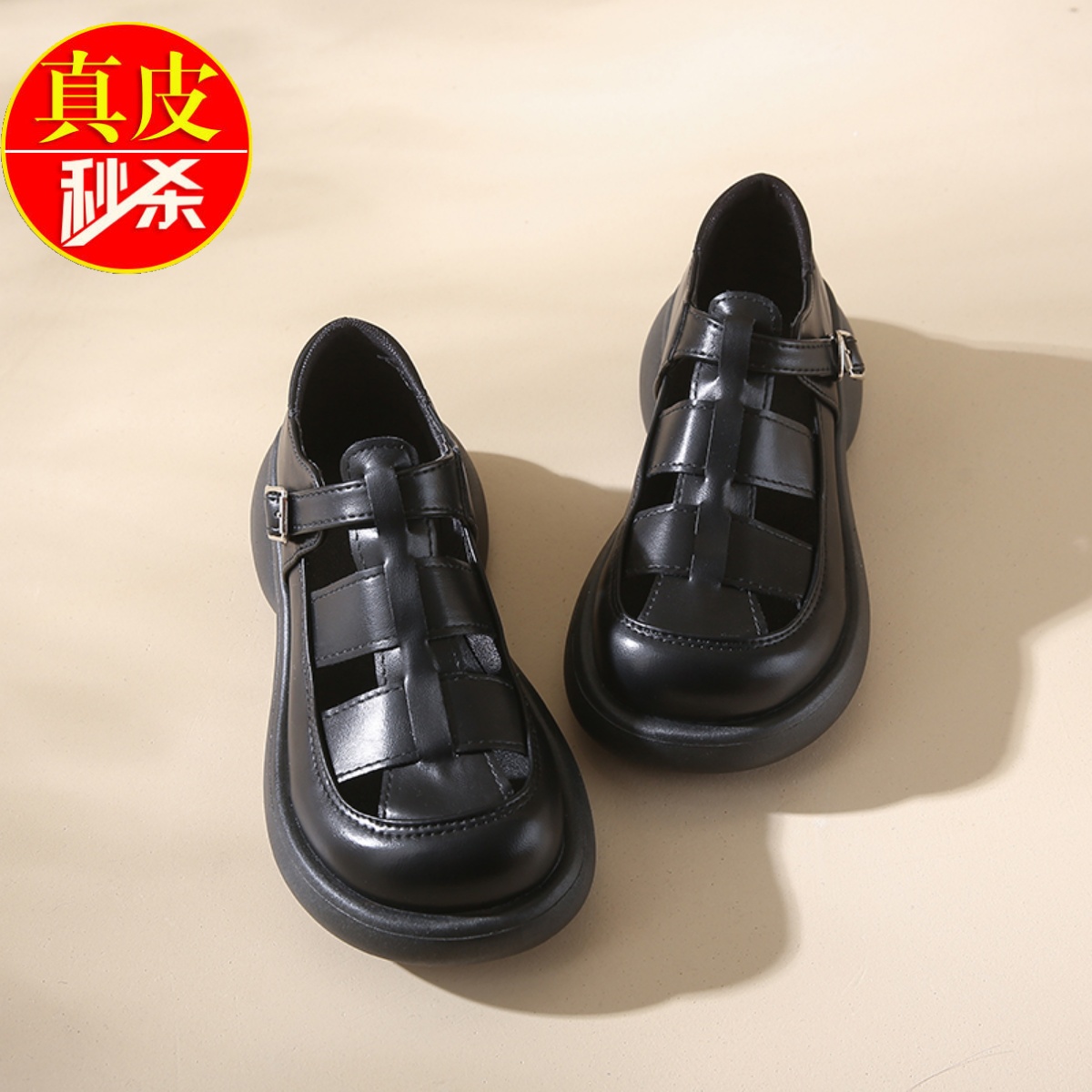 青蕴真皮厚底凉鞋女夏季2023新款时尚百搭编织镂空休闲包头罗马鞋