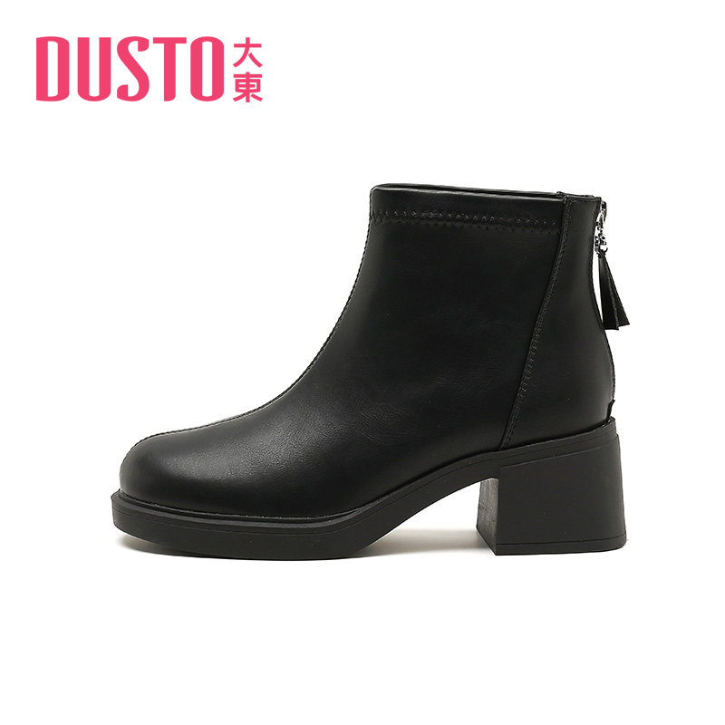 大东粗跟短靴2023冬季新款休闲圆头高跟后拉链绒里时装靴女鞋0009