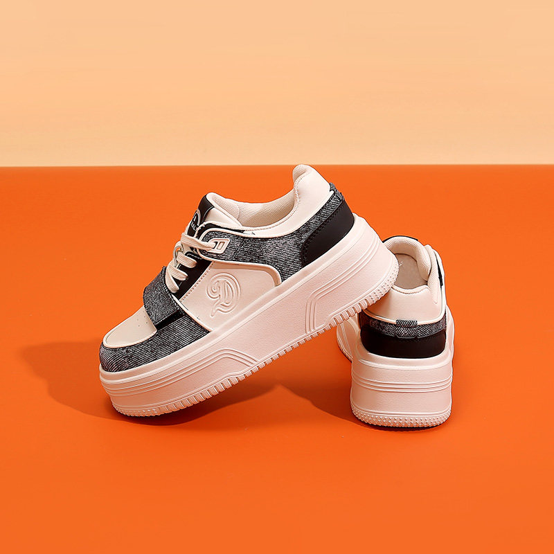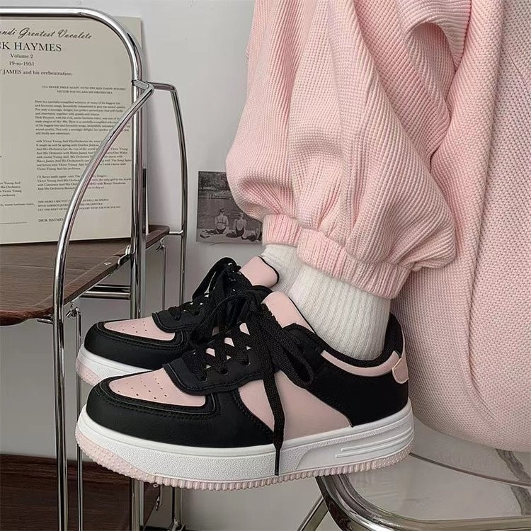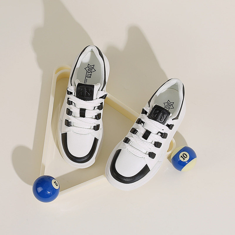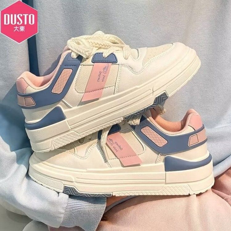 大东拼色板鞋女鞋2024春季新款休闲中跟平底小白鞋圆头系带鞋0903