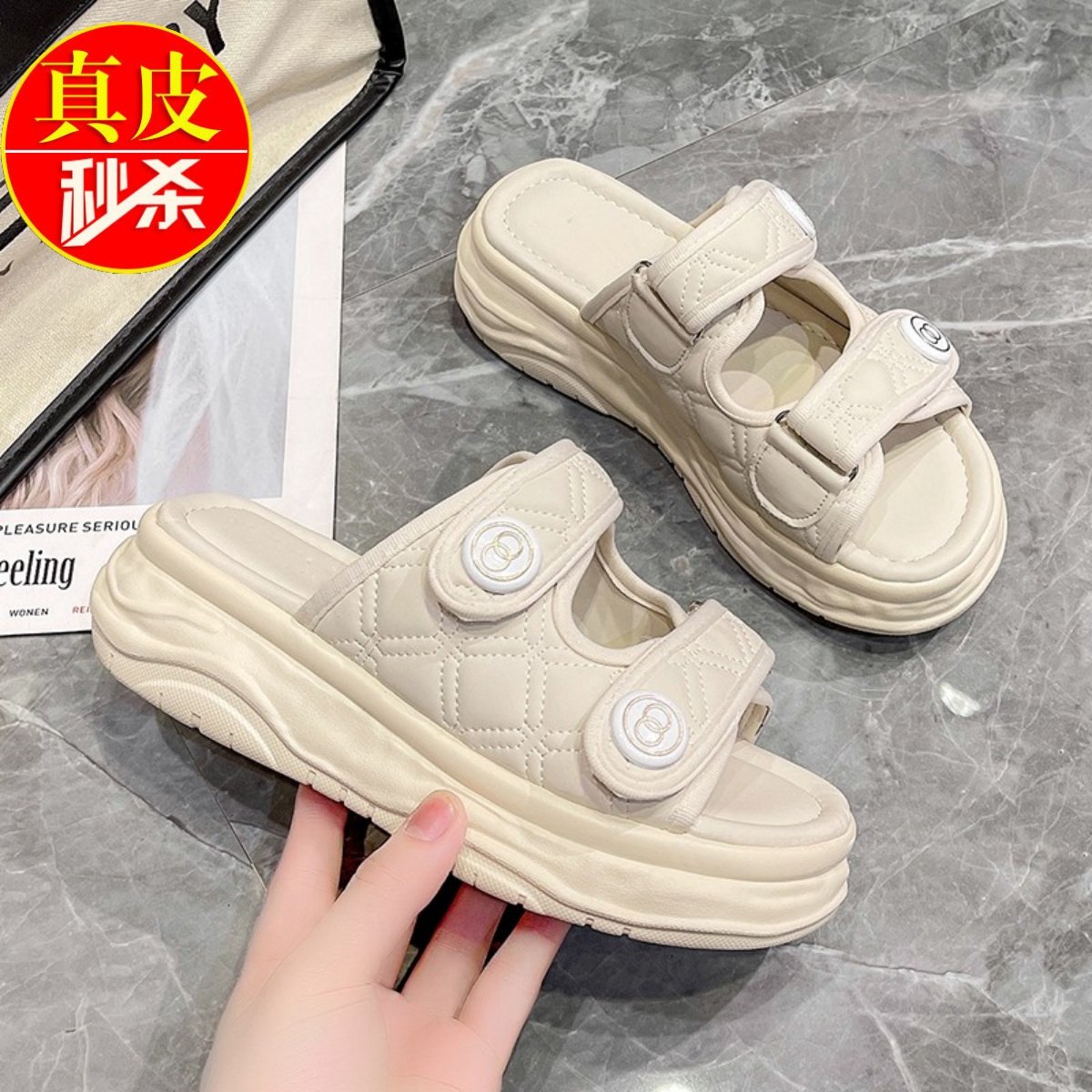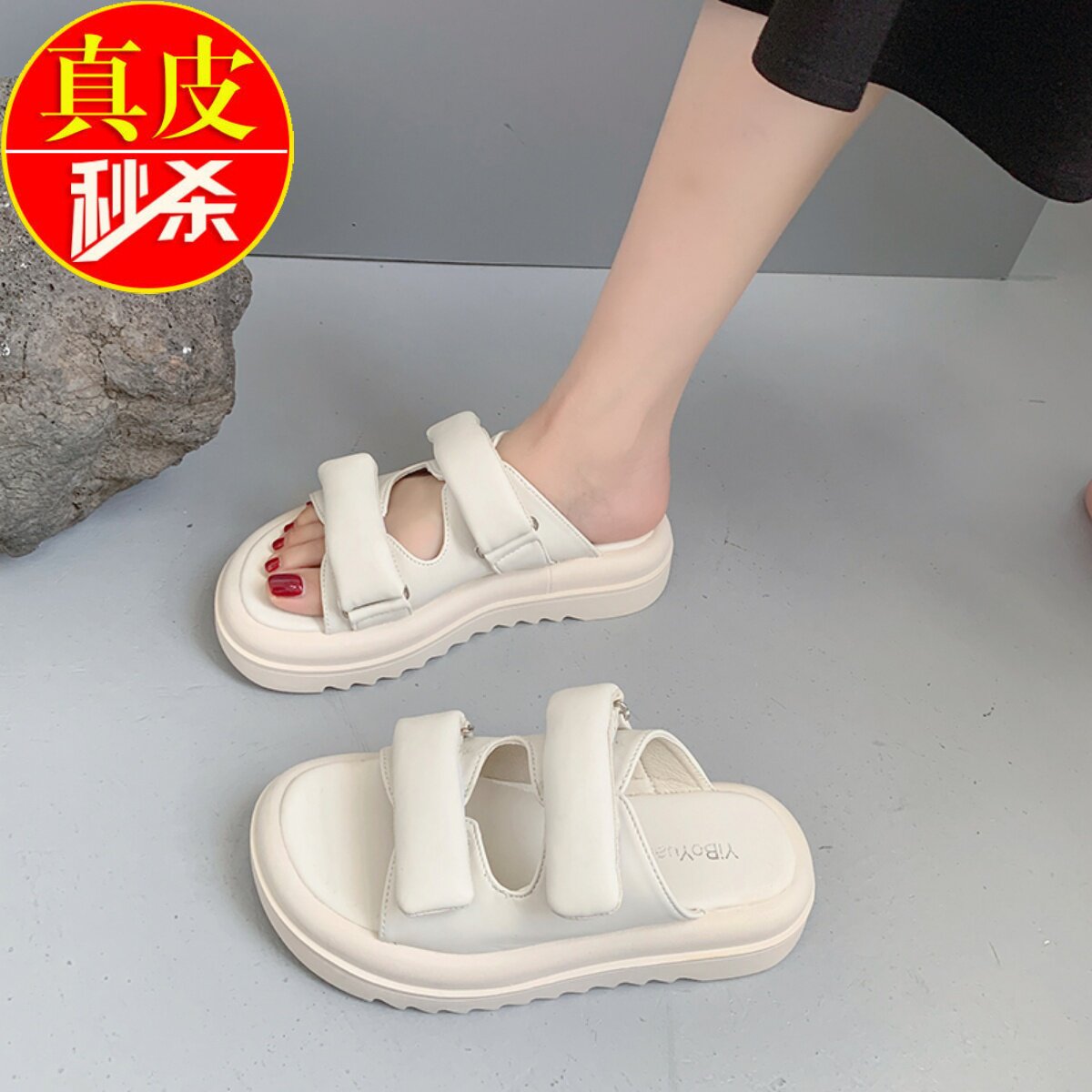 青蕴真皮小香风一字拖鞋女2023年夏季厚底外穿魔术贴休闲沙滩凉拖