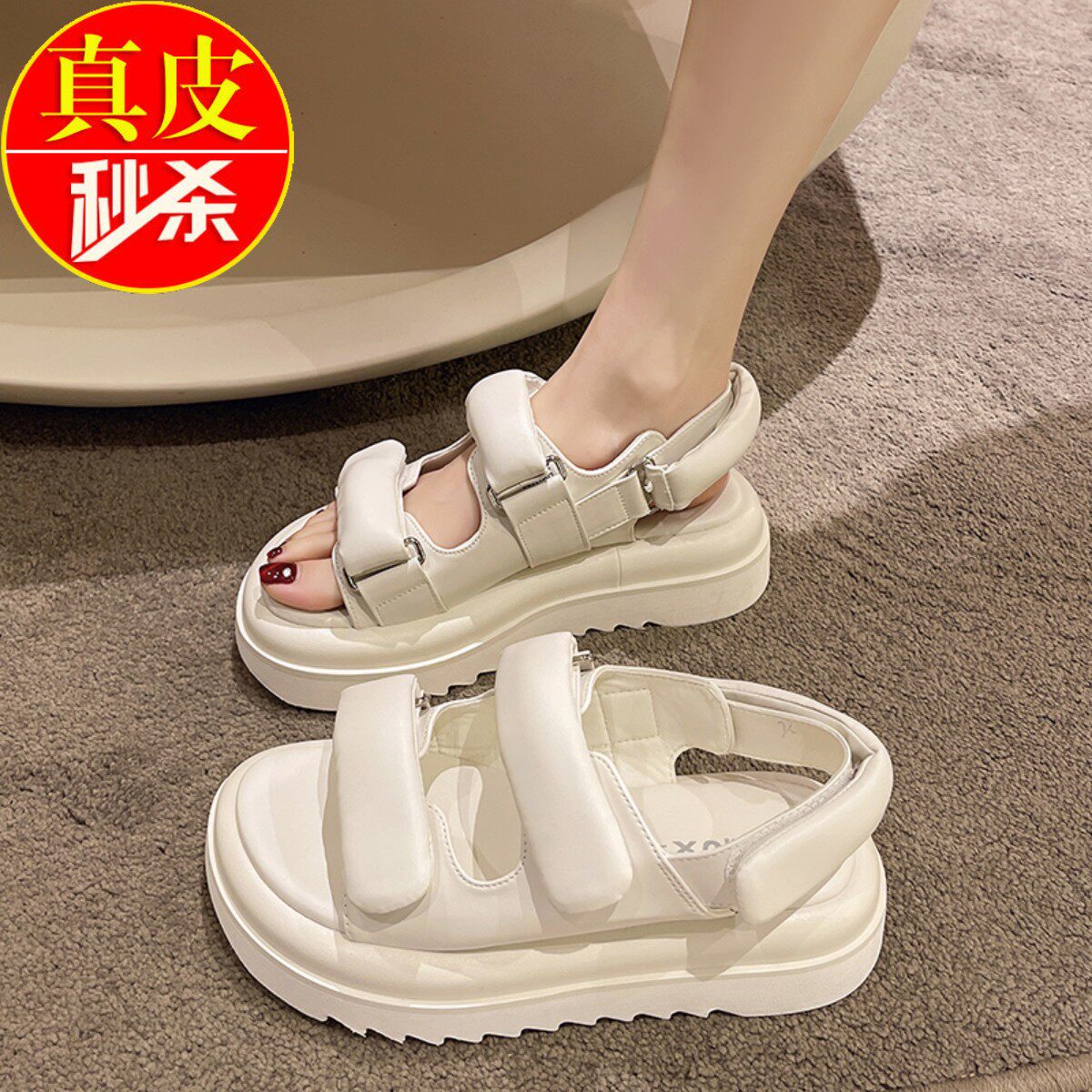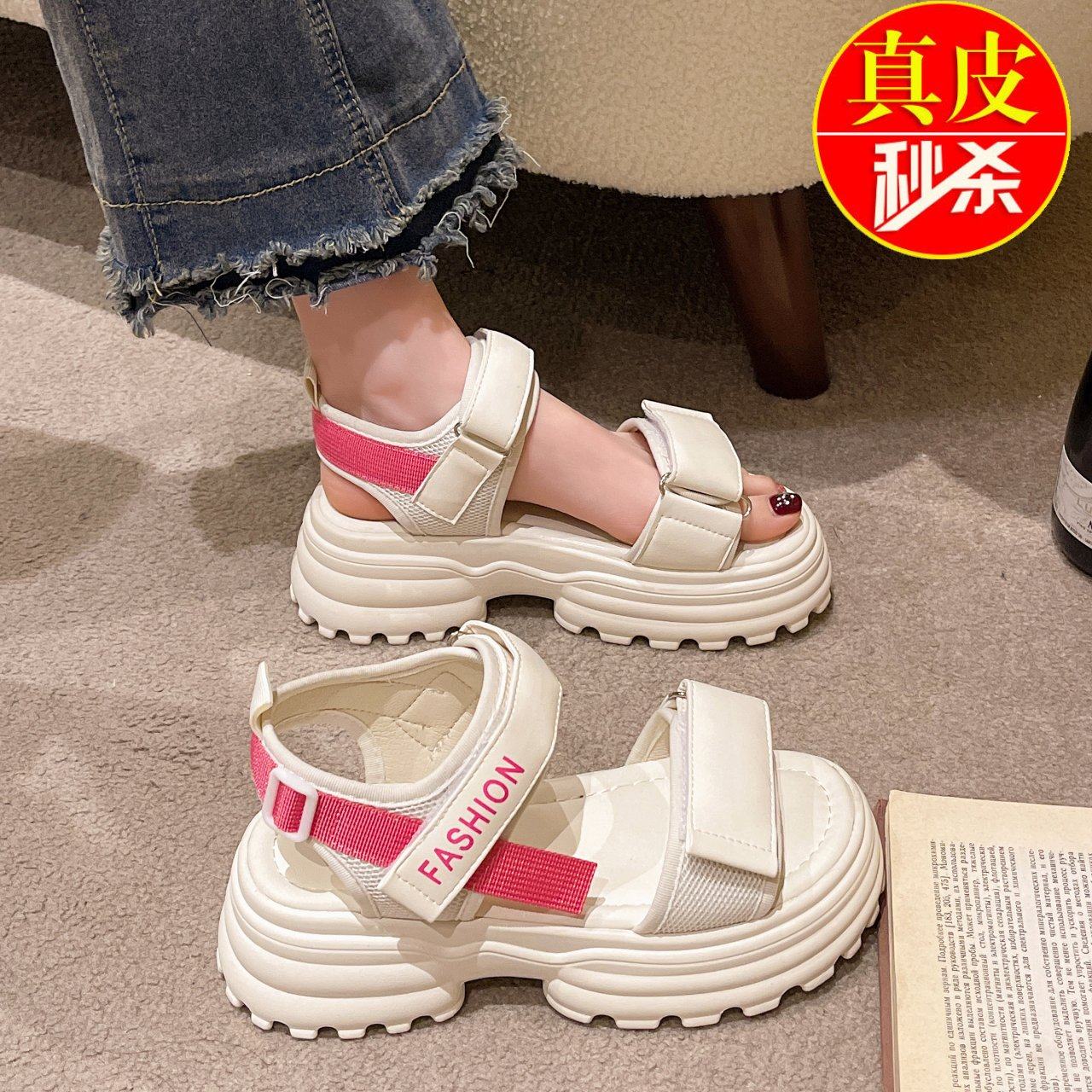 青蕴真皮小香风凉鞋女2023年夏季新款魔术贴百搭运动厚底沙滩鞋子