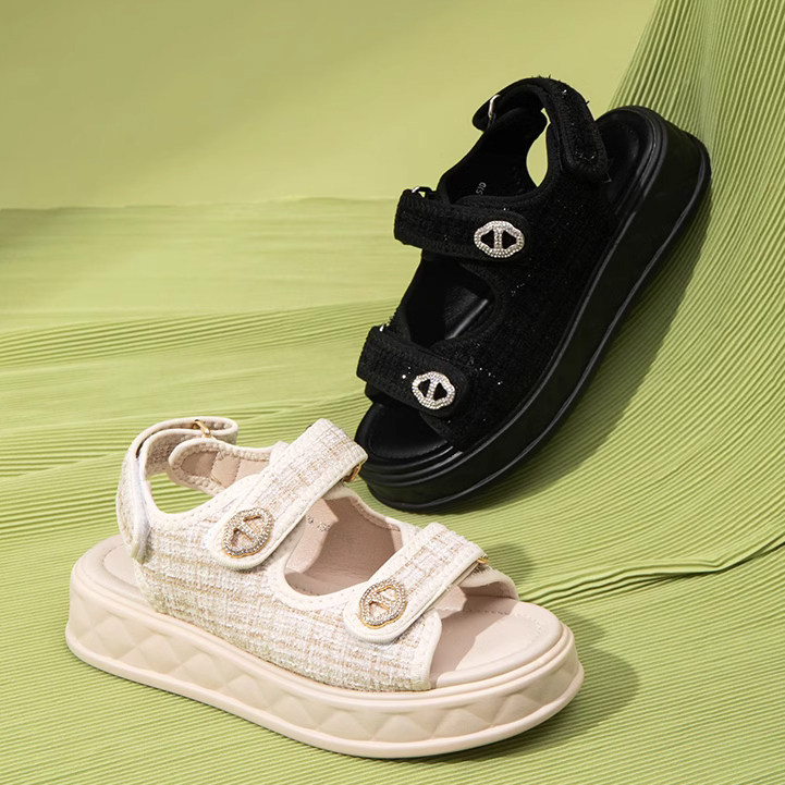 大东官方旗舰店厚底凉鞋女2023新款夏季平底金属水钻魔术贴女鞋潮