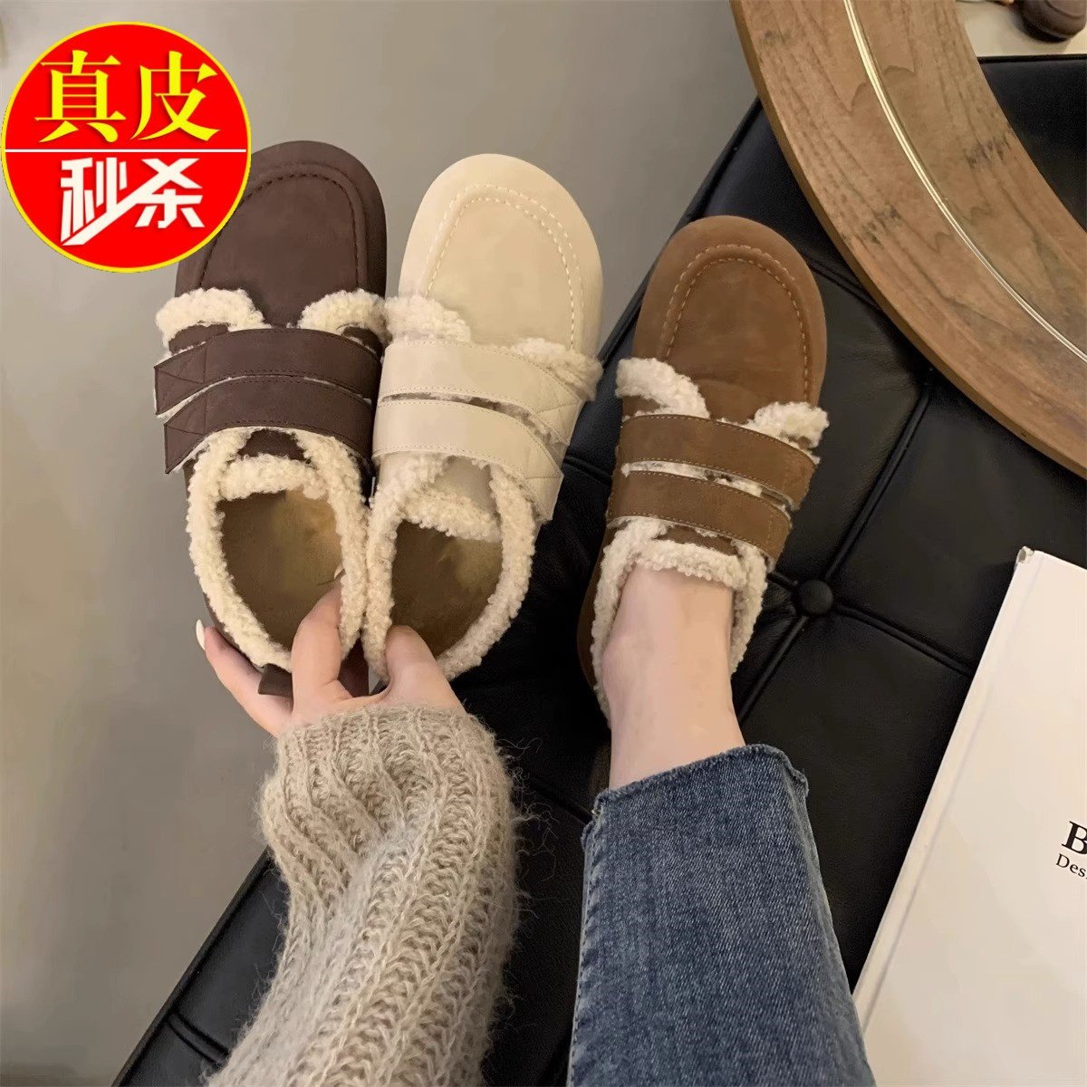 青蕴真皮复古丑萌鞋女2023新款学院魔术贴勃肯鞋平底防滑加绒棉鞋