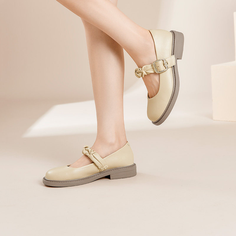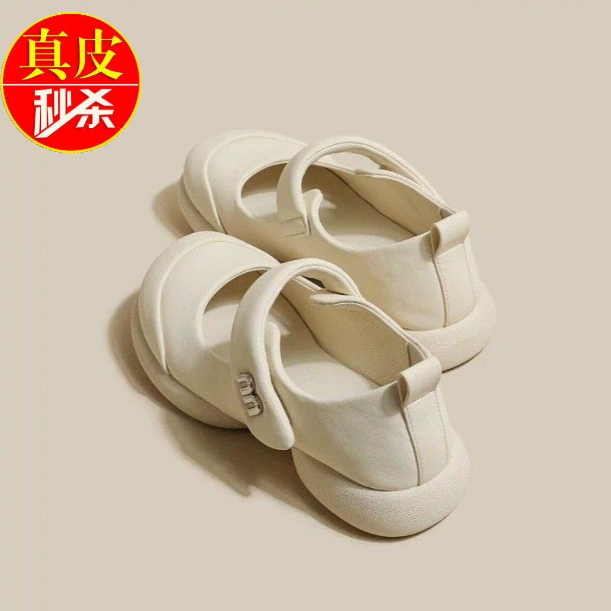 青蕴真皮复古圆头浅口玛丽珍女鞋2023夏秋新款小众魔术贴丑萌单鞋