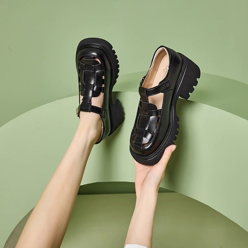 青蕴真皮运动凉鞋女增高厚底松糕设计小众日系露趾魔术贴罗马凉鞋