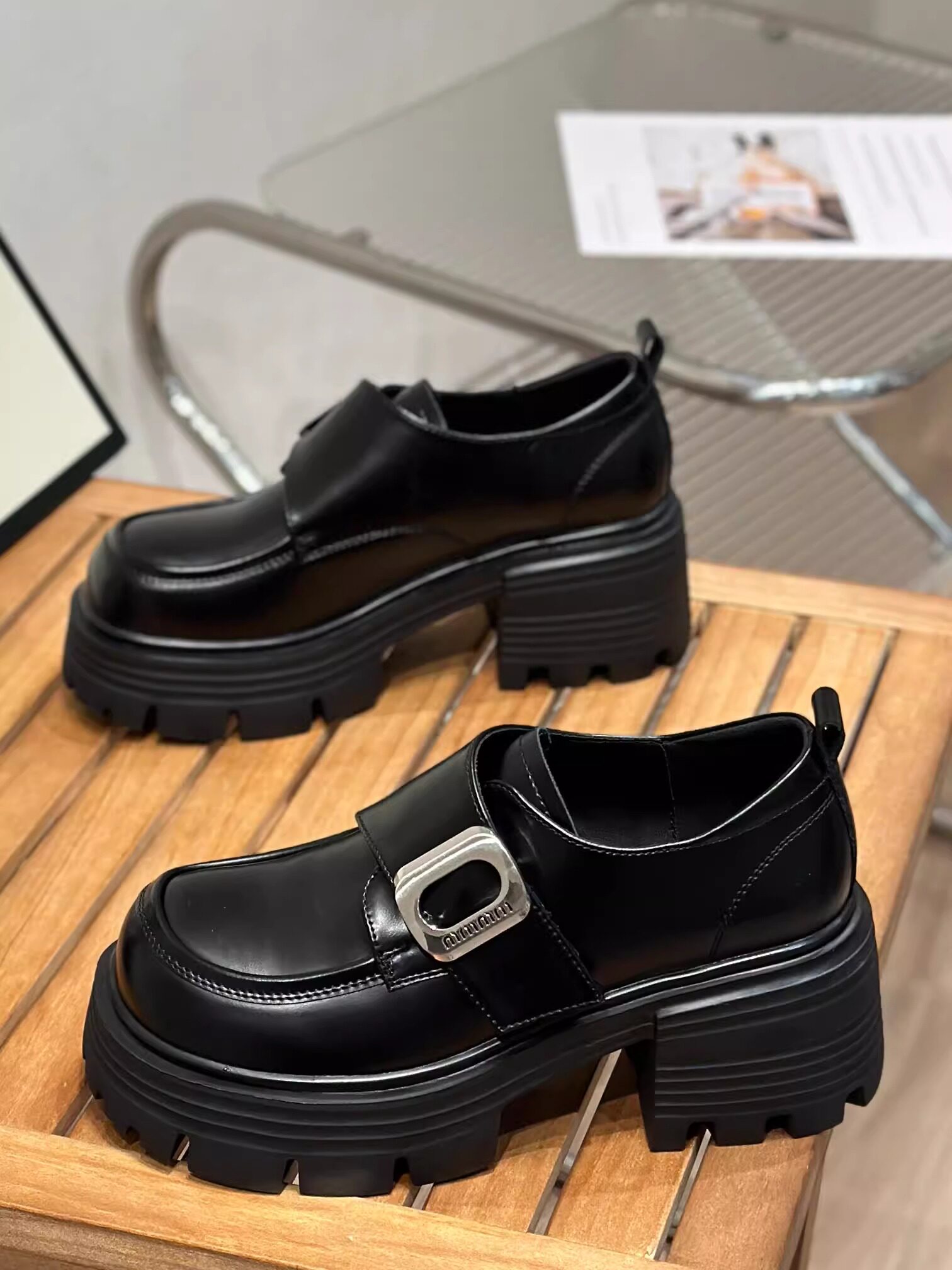 大东厚底乐福鞋女7m增高鞋子真皮魔术贴学院风小皮鞋粗跟黑色单鞋