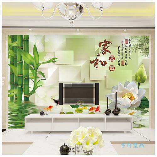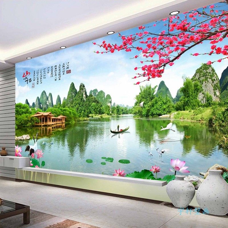 电视沙发背景墙布田园大自然风景竹子荷花墙纸8d立体山水装饰壁画