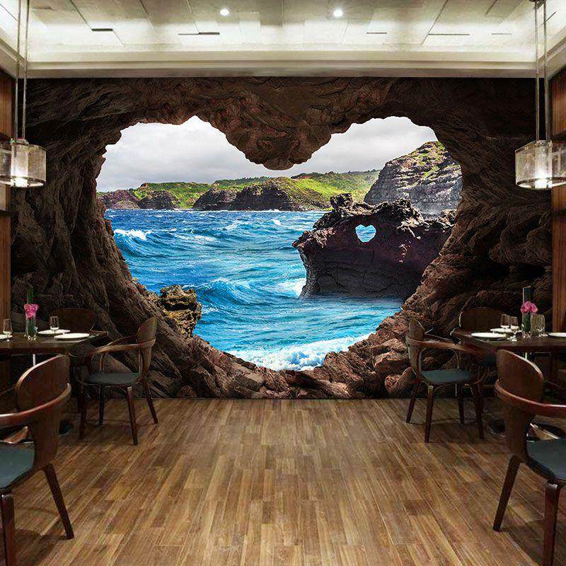 空间延伸沙发壁纸大自然风景山洞海景瑜伽室壁纸饭厅酒店墙布