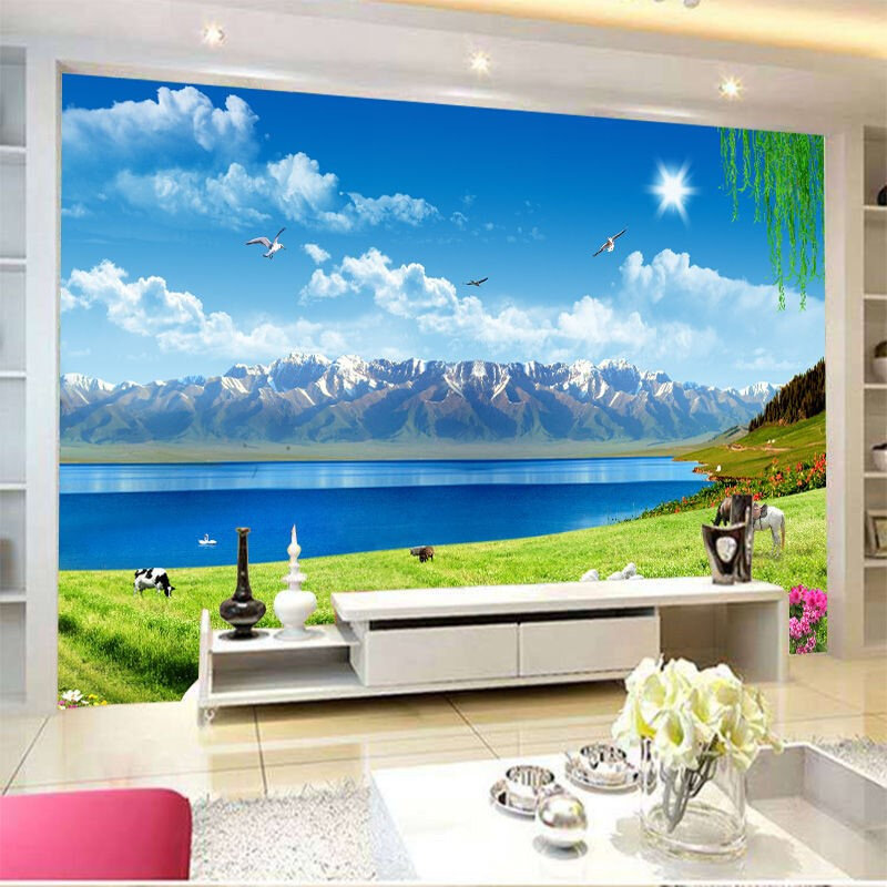 3D大自然湖畔草原风景墙布蓝天白云电视背景墙布客厅沙发装饰壁画