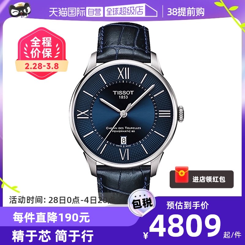 【自营】Tissot天梭 杜鲁尔系列瑞士自动机械男表皮带手表送礼物