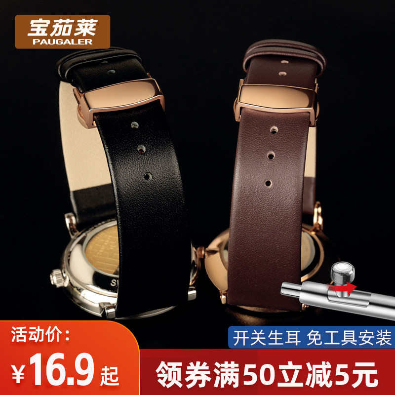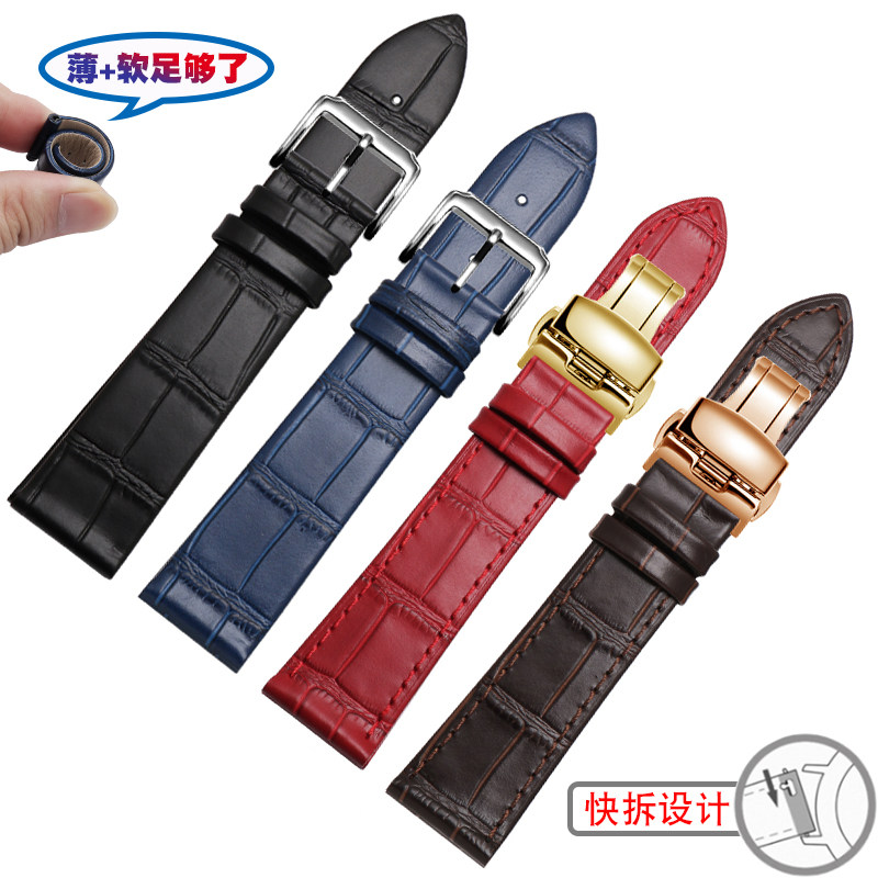 表带真皮柔软超薄防水牛皮手表链蝴蝶扣配件男女代用天梭DW浪琴CK