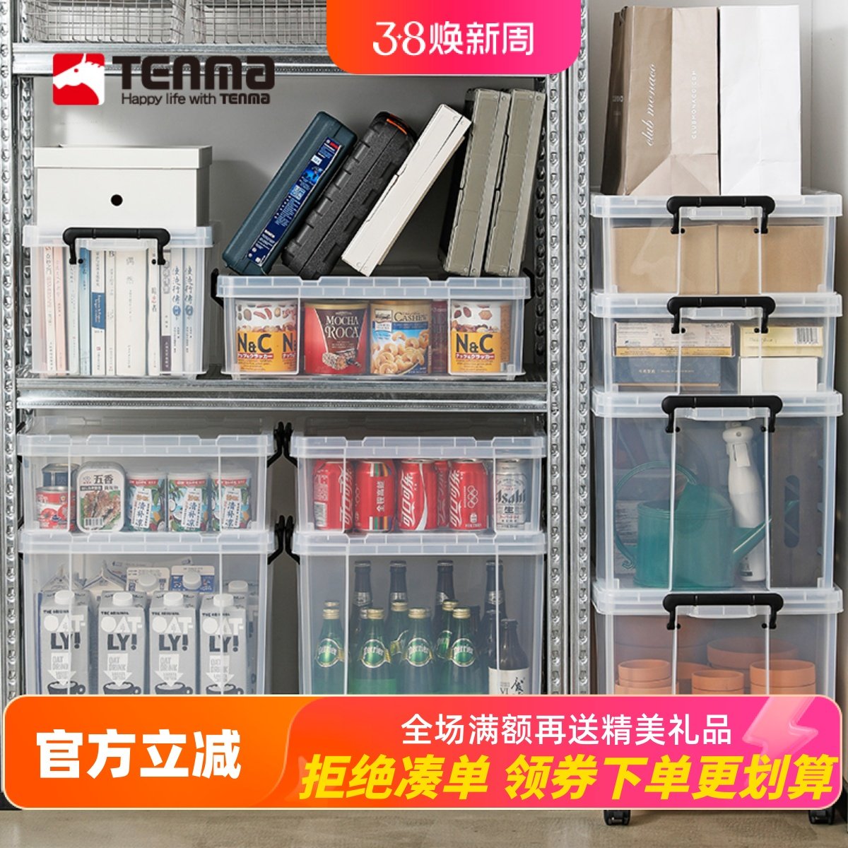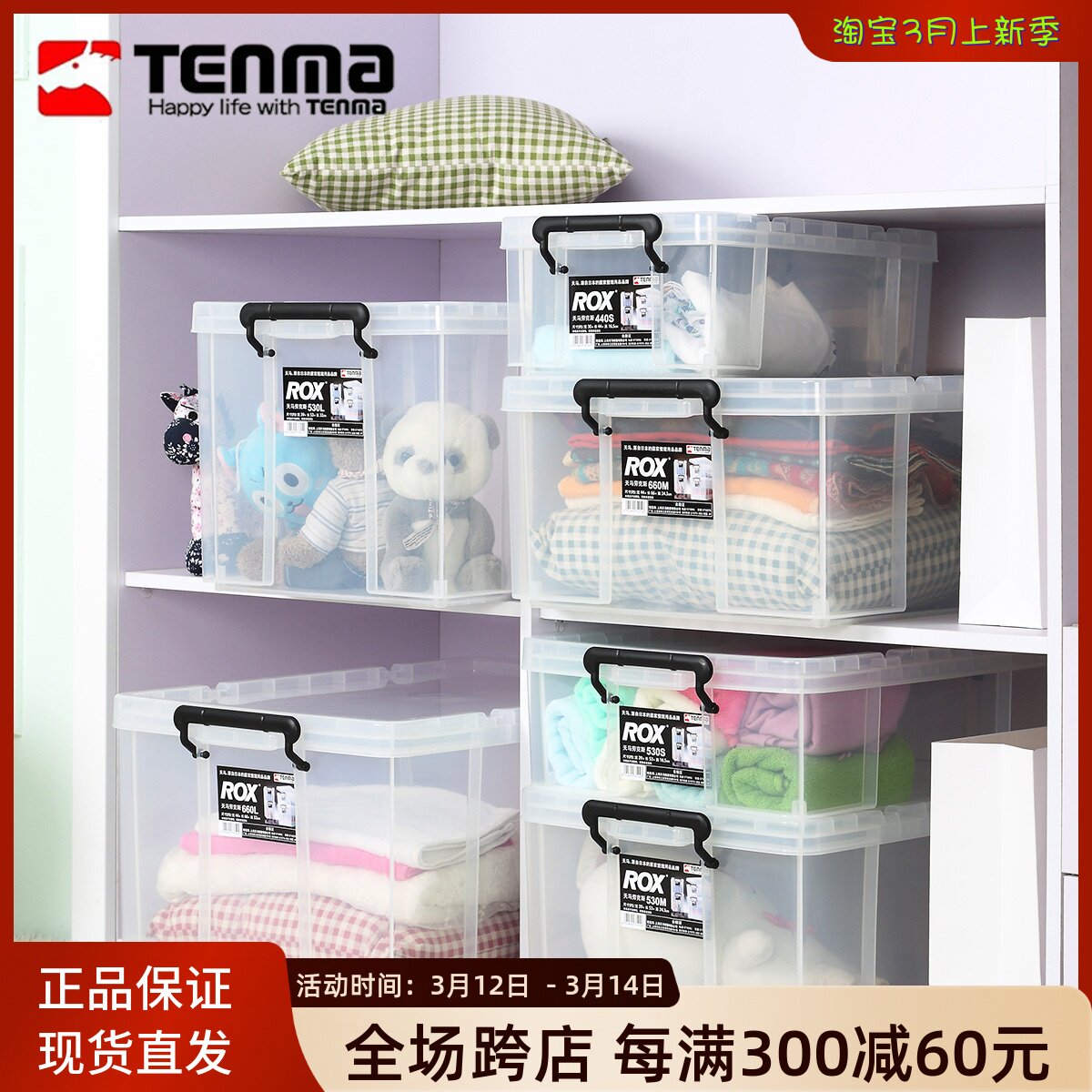 日本Tenma天马玩具收纳箱家用透明衣物整理箱手提式塑料收纳盒