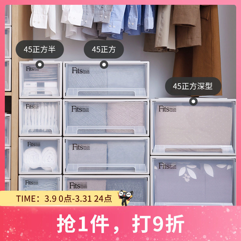 天马株式会社45正方抽屉式收纳箱塑料整理箱衣柜储物透明收纳盒