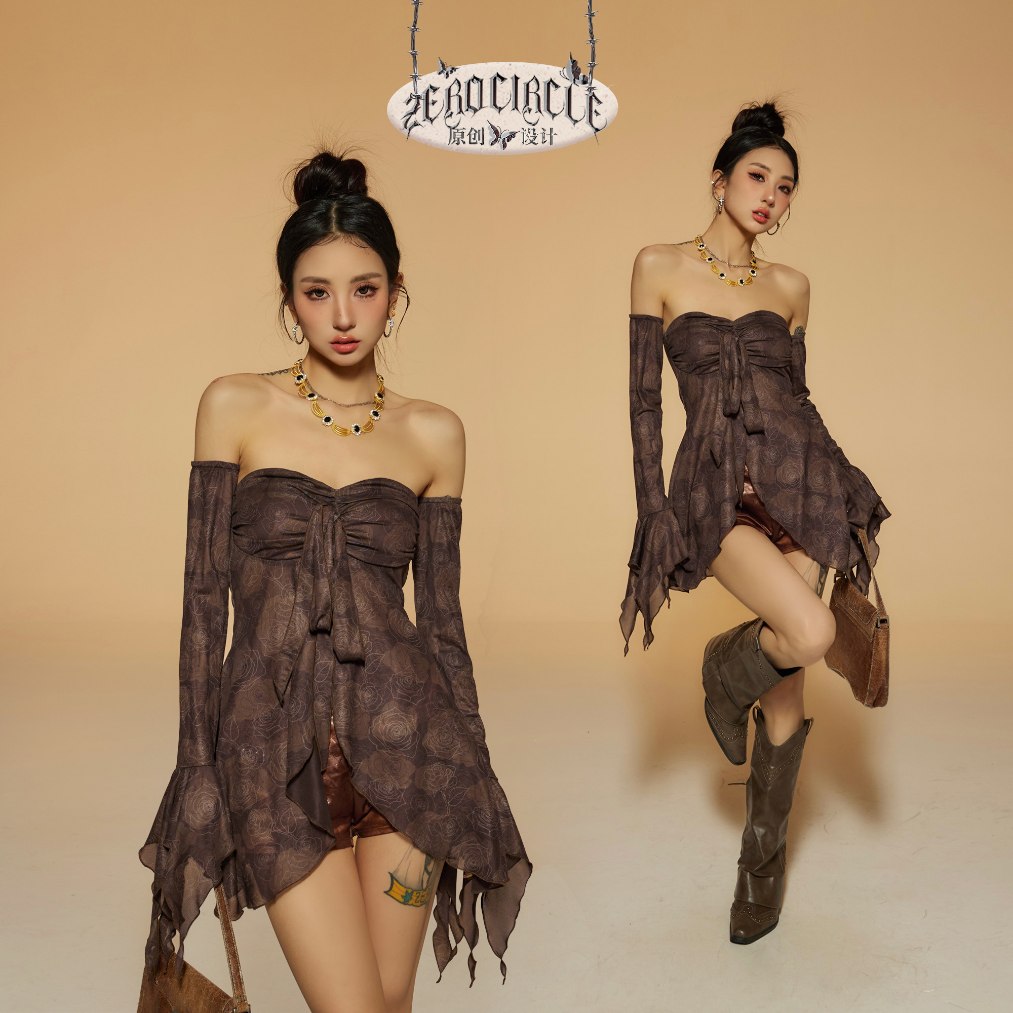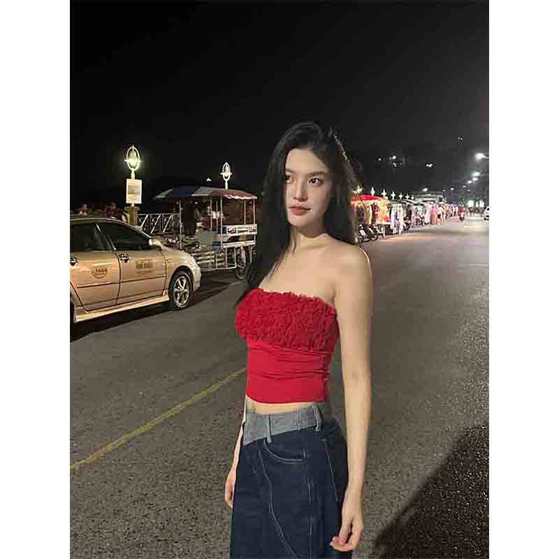 设计感红色玫瑰花短款露肩抹胸背心女春季新款纯欲辣妹超好看上衣