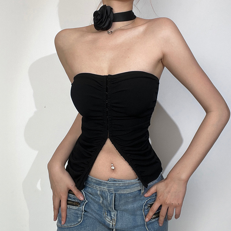 KLIOU 又酷又飒个性黑色褶皱无袖抹胸背心女短款修身显瘦辣妹上衣