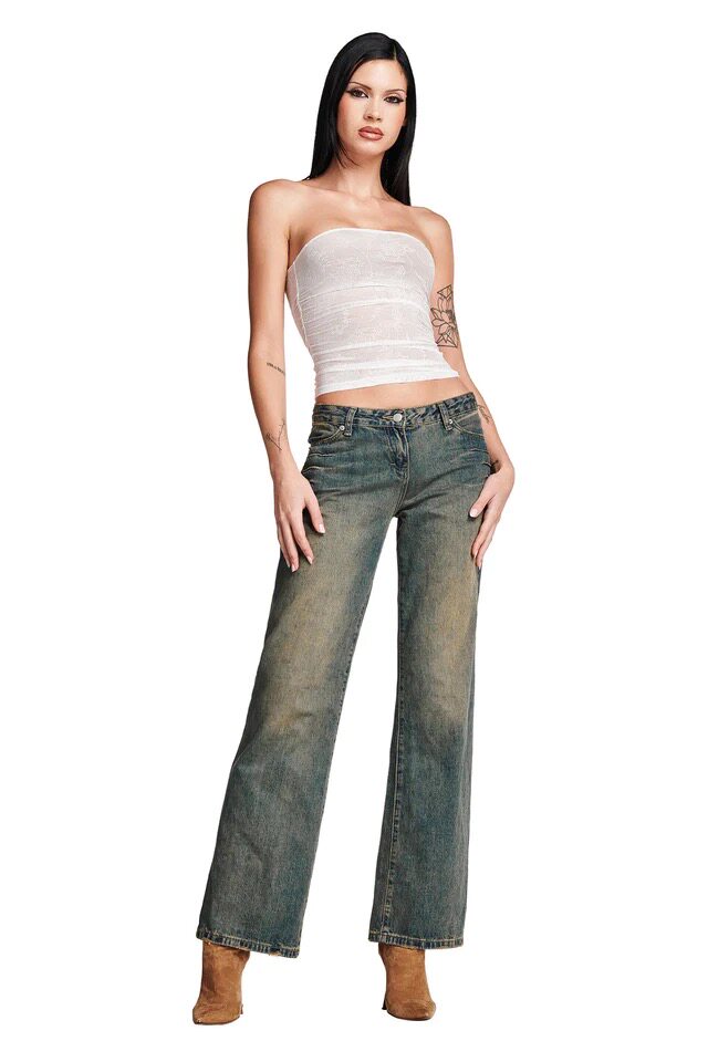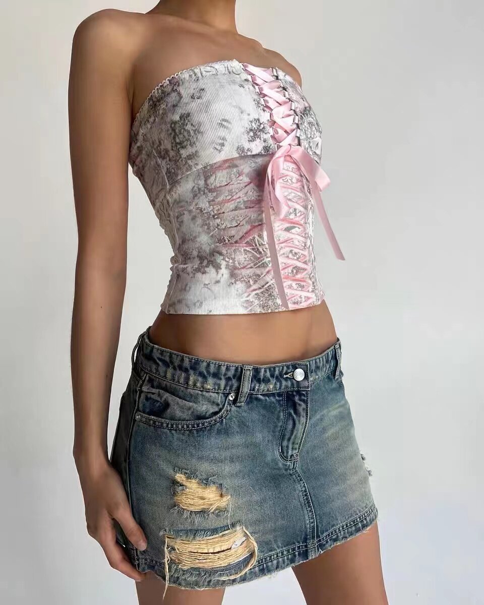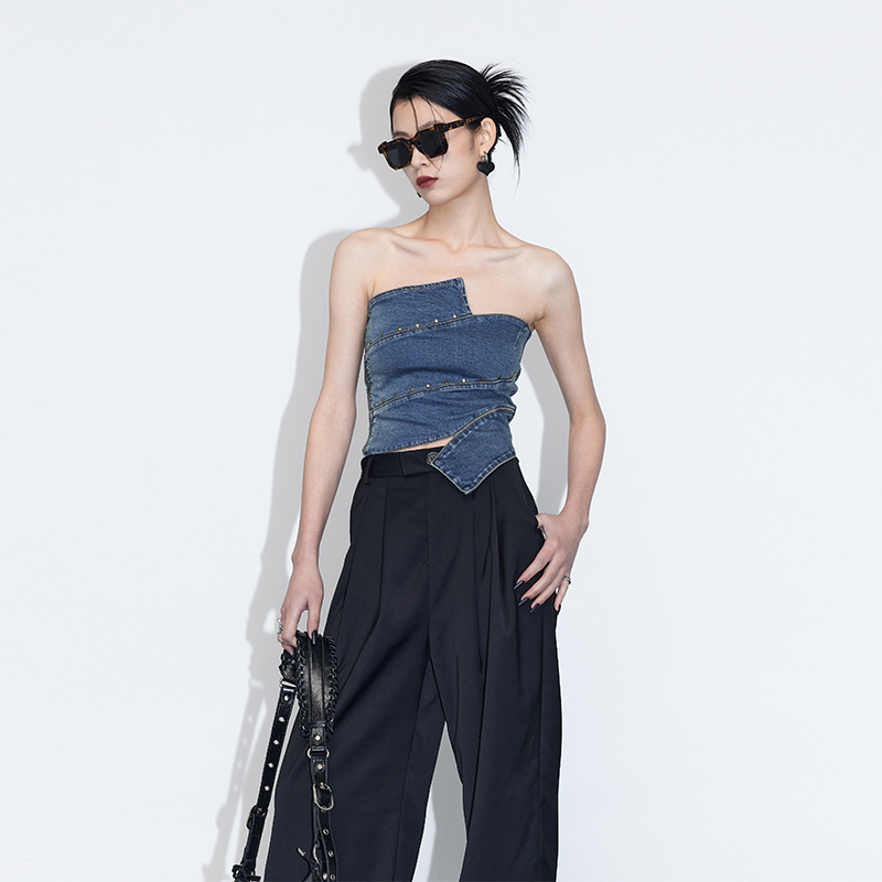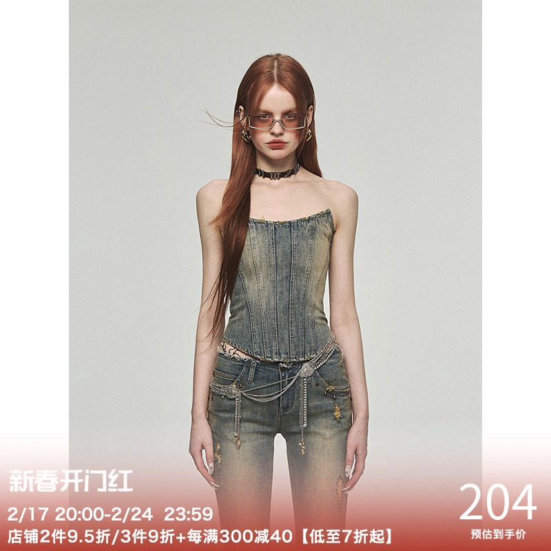 1JINN STUDIO 重工水洗做旧牛仔小心机收腰显瘦无带抹胸上衣外穿