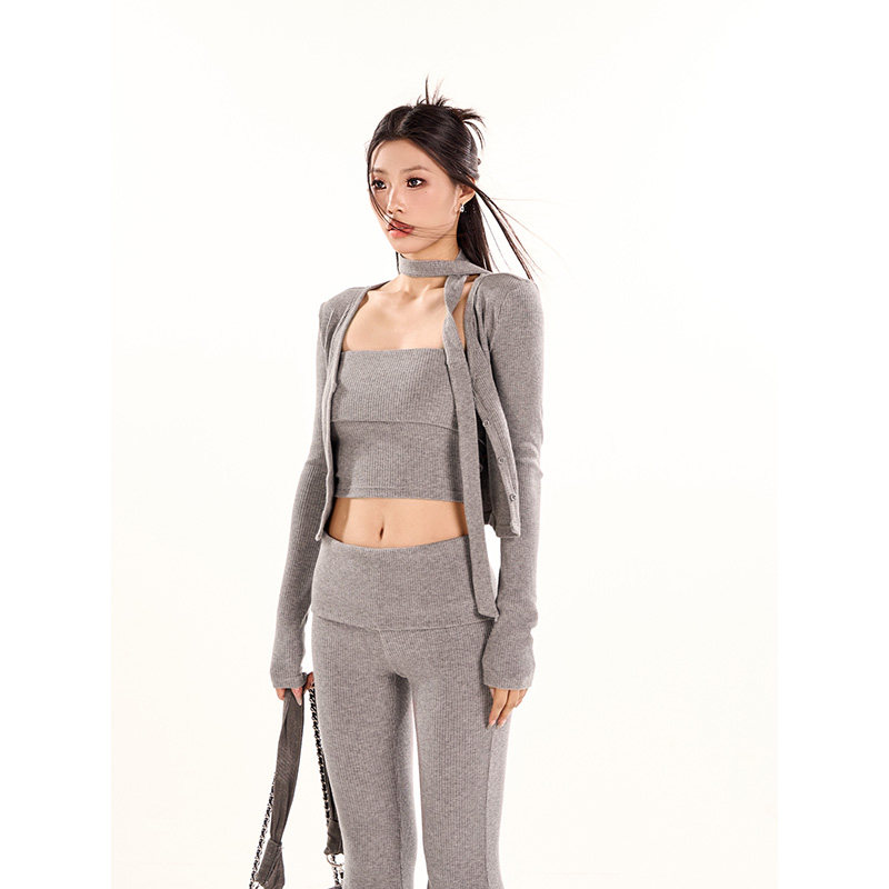 野生zerocircle灰色针织开衫三件套装女春秋抹胸上衣修身微喇裤子