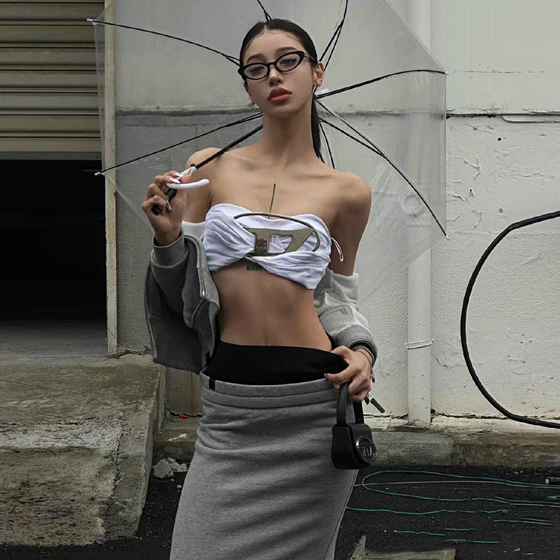 KLIOU 美式辣妹风个性镂空银色抹胸背心女短款显瘦高腰露脐上衣潮