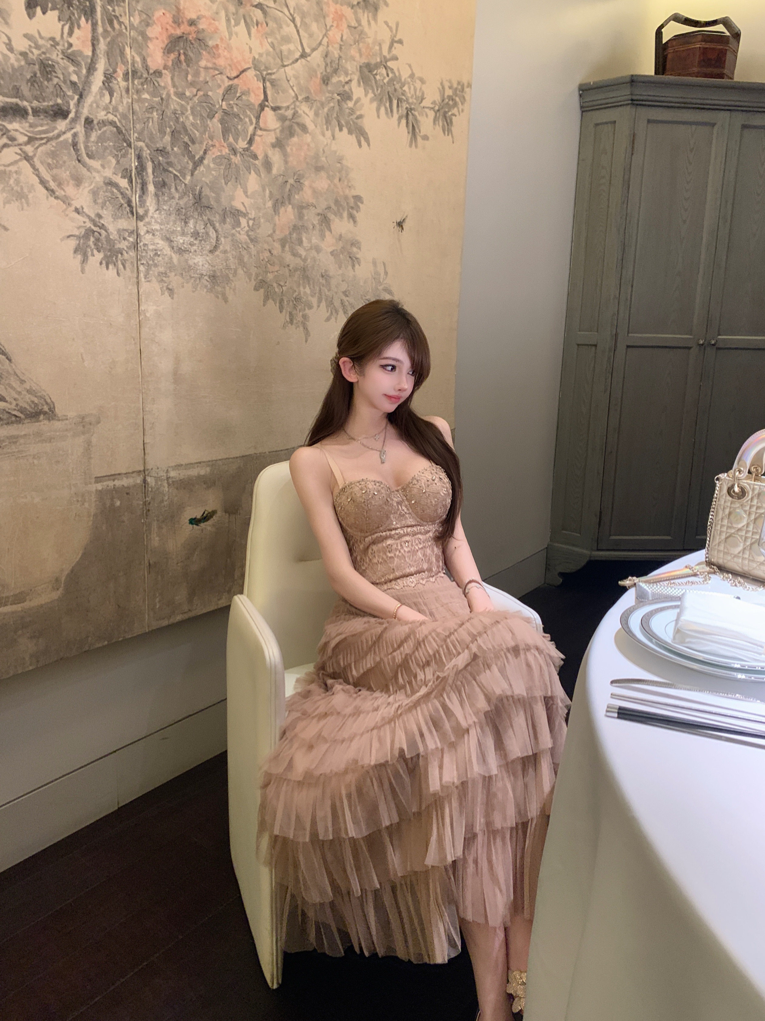 街头辣妹风镂空蕾丝抹胸绑带上衣两件套高腰气质双层包臀长裙套装