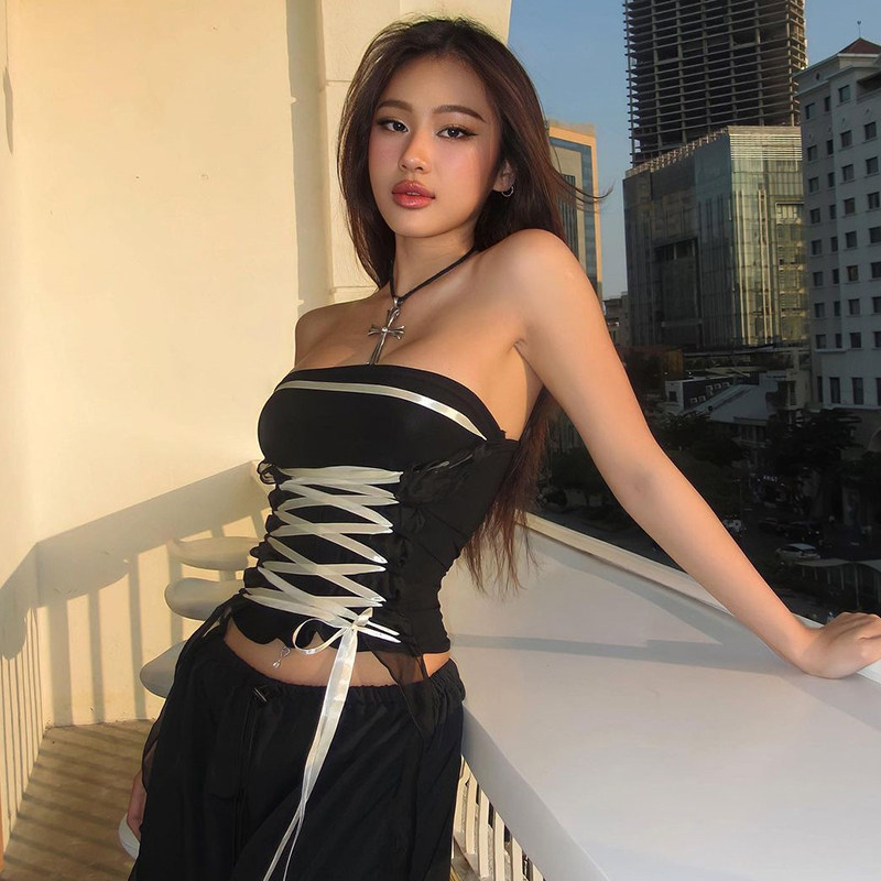 iamgia欧美辣妹芭蕾风粉色丝带交叉蝴蝶结抹胸紧身露脐短上衣