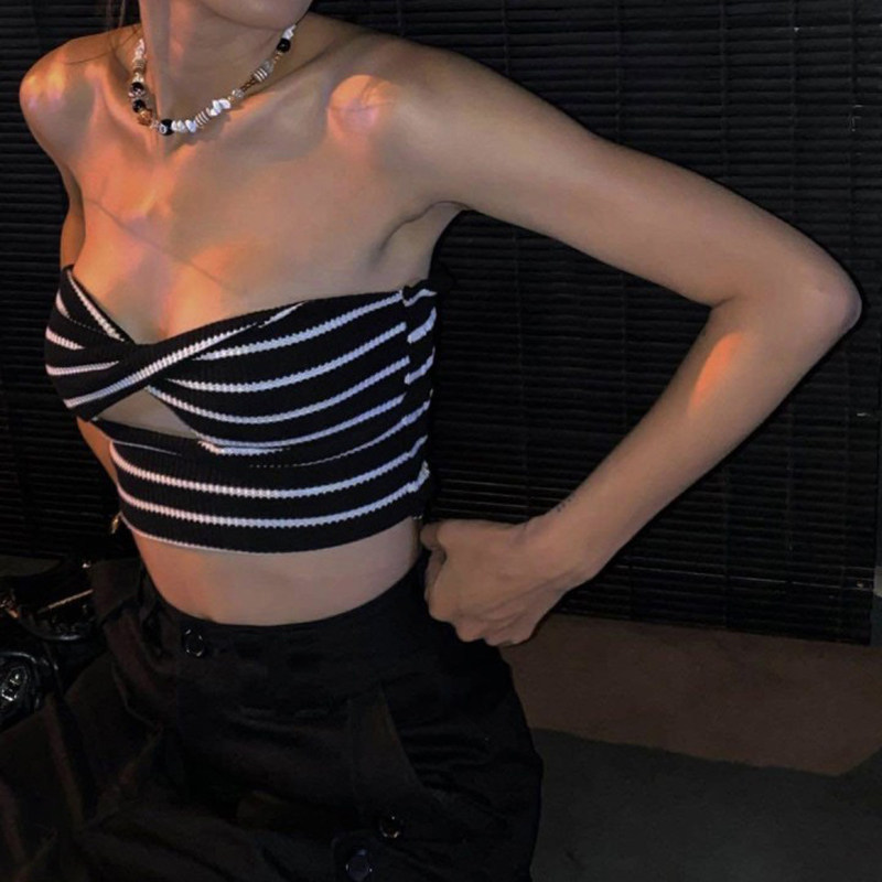 KLIOU 欧美ins条纹撞色抹胸背心女小心机镂空扭结紧身显身材上衣